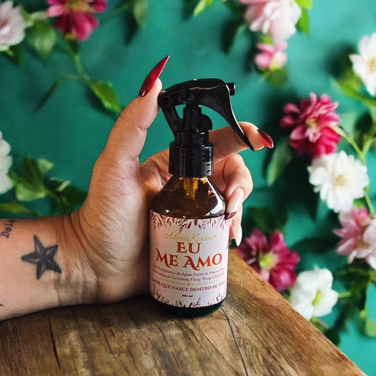 O Spray Terapêutico “Eu Me Amo” Almakura é um abraço em forma de spray, pensado para reacender o amor que mora em você.